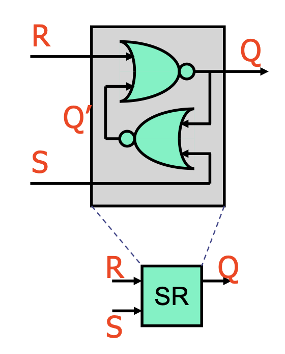 The SR-latch (set-reset) puts two NOR gates together to maintain a state Q. The set signal sets Q to 1, and R resets it to 0. If both are 0, then Q is unchanged; if both are 1, thereโs undefined behavior.