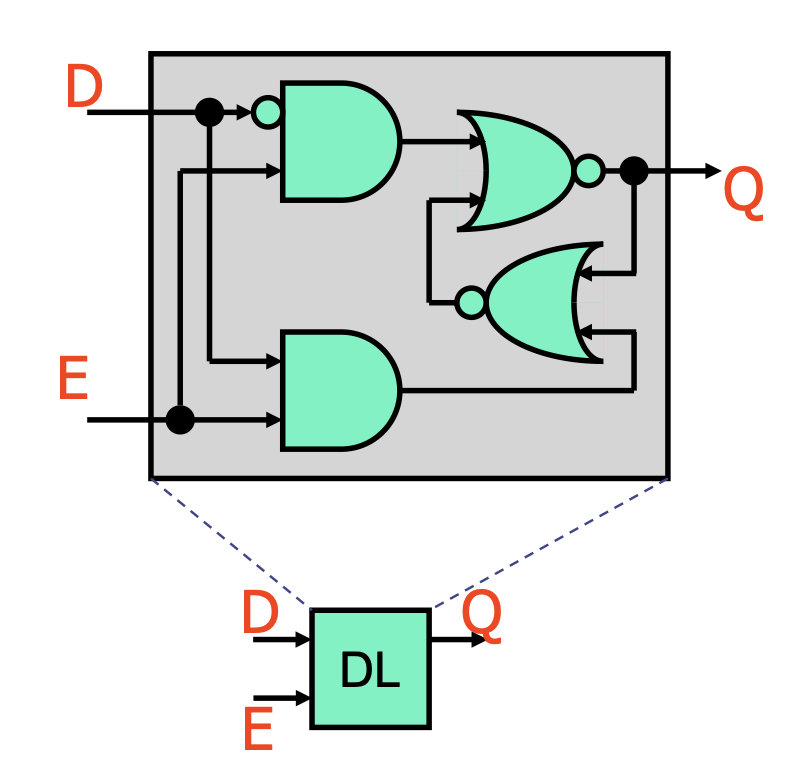 The D-latch (data) extends the SR latch by providing a easier interface to work with: D is saved into the state as long as E is 1.