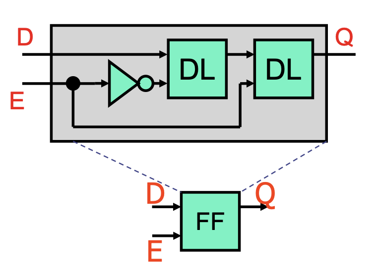 The D-flip-flop implements the edge-triggered idea above. Using two sequential D-latches enabled by inverse signals, the input D will only be saved if E changes in the middle of the two latchesโthereby achieving our desired effect. In this setup, E is commonly set as the clock signal, so D will periodically update on every clock tick.