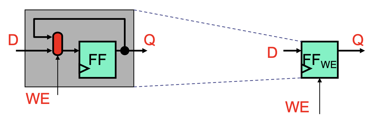 To add an extra write-enable WE control to the flip flop, we can use a mux to decide the input: the state value if WE is 0 and D if WE is 1.