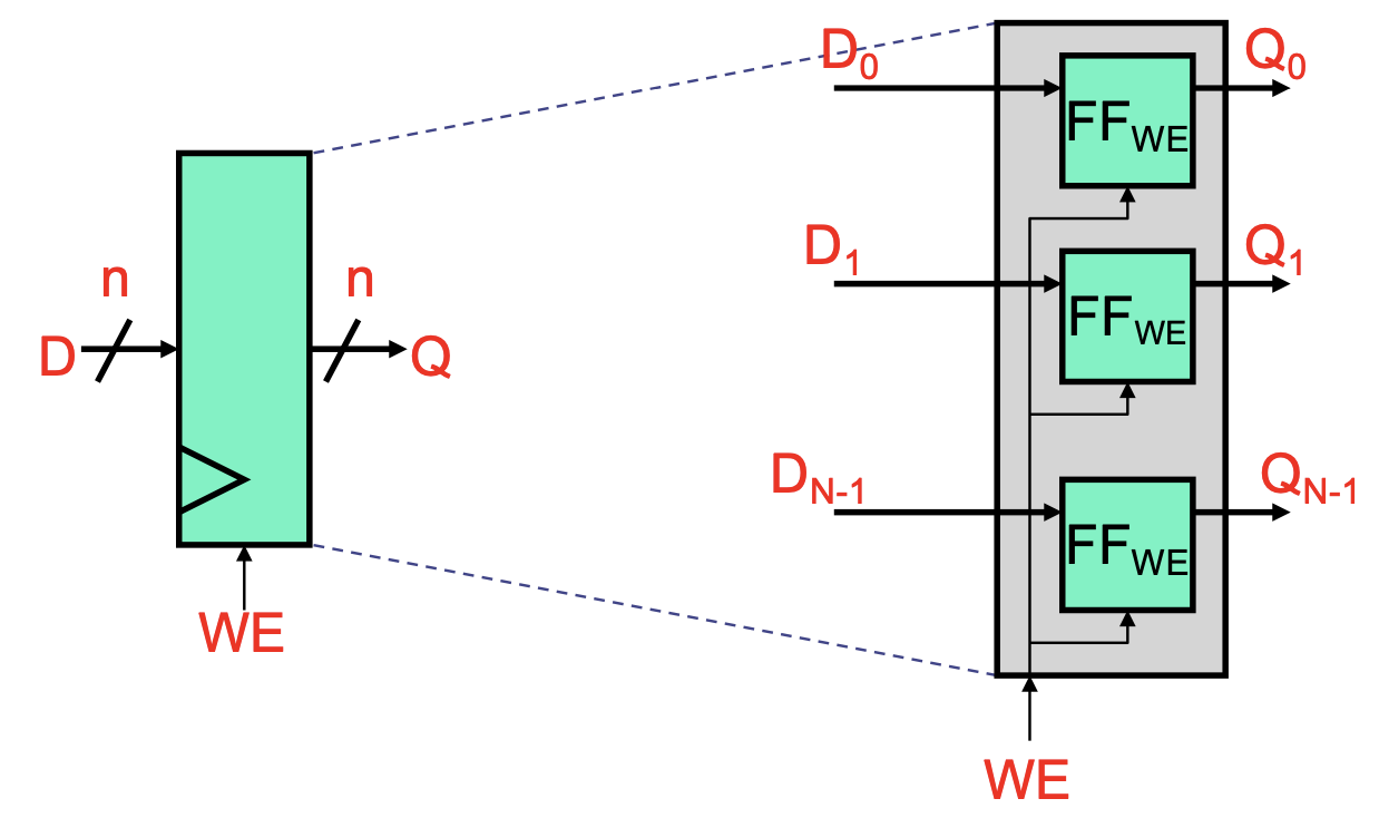 Putting WE wire, we get an N-bit register. The input is saved only on the clock edge when WE is 1.